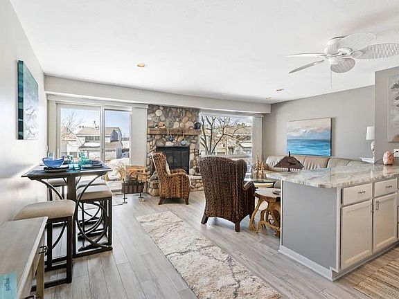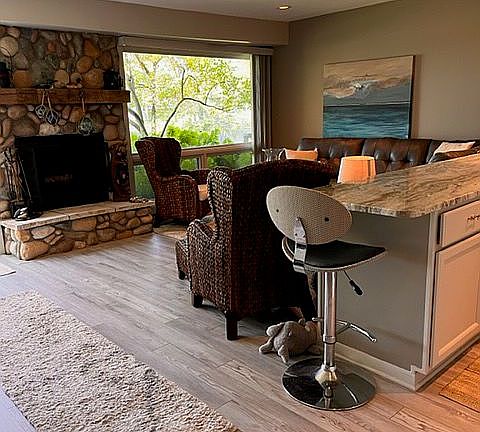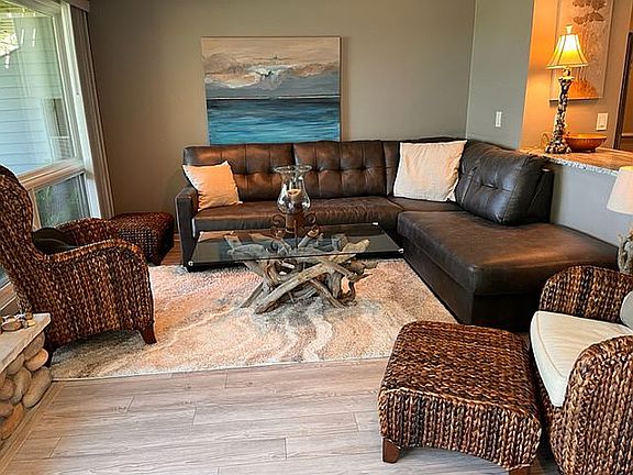 Two-bedroom, two full bath unit has a complete kitchen with new appliances, and the unit was completely renovated in 2020-2021 with neutral tones and sea-themed accents in summer, snow accents and a wood-burning fireplace in winter. Just a few steps to the bay with water views from both living room windows.