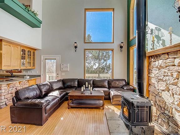 Welcome home to your dream cabin retreat sitting on 1.64 acres with gorgeous mountain views and matured trees located in the Spring Mountain National Forest behind Mount Charleston Mountain and only 20 min to Pahrump. The 3 Story cabin is custom built with an open floor plan, very cozy and spacious living areas featuring 2 bedrooms and 2.5 baths, spiral staircase to the primary bedroom level on the top floor with breathtaking views. Spacious Sunroom and wrap around balcony to enjoy the stunning scenery. Vaulted ceilings with large windows and wood burning and electric fireplace to enjoy while entertaining and enjoying the different seasons. Property sits on 3 combined lots with endless potential awaiting for your imagination to make it your perfect escape cabin retreat.