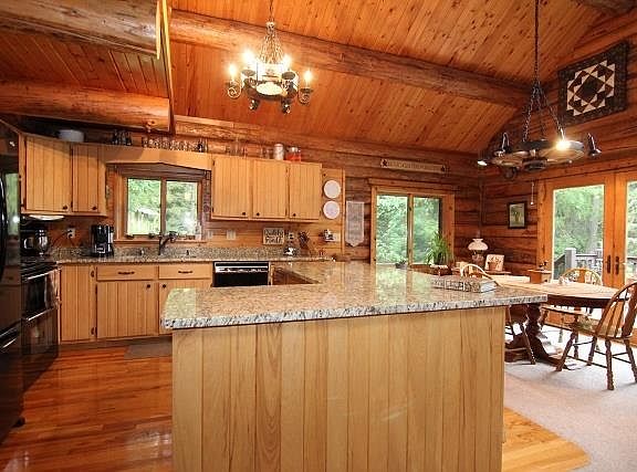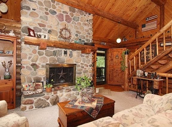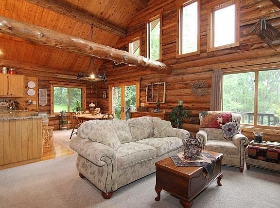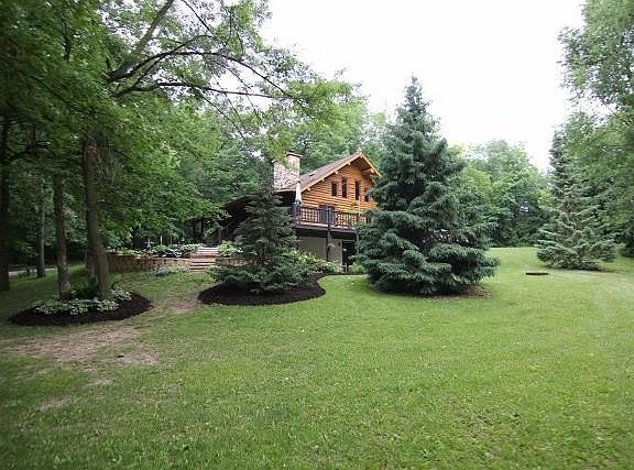 Live in a retreat style atmosphere year around with this Lodge Pole Log home. Sited on 26 very private acres complete with a pond and it offers easy access to Madison, Janesville or Stoughton. Comfortable floor plan offers an open kitchen with granite counter tops, cozy living room with a fieldstone fireplace and the lower level family room offers a walk out. 36' X 80' outbuilding offers shop and storage space. Enjoy the summer months relaxing on the front porch. Room sizes and SF are approximate.