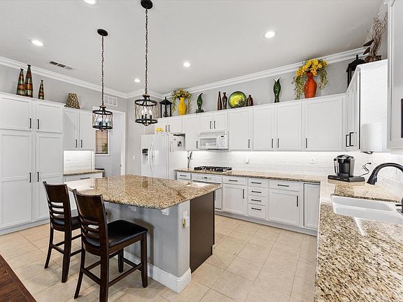 Step into this luxurious Del Web Willow floor plan in the 55 and older community of Solara! This home beams with pride of ownership with a remodeled master bathroom suite, tiled flooring throughout, freshly painted interior, refinished garage flooring for the meticulous homeowner. The two bedrooms each have their own bathrooms plus a guest bath. Need a home office or 3rd bedroom! The kitchen is prestine with a large breakfast island, pantry and a dining room which overlooks the living room area. The abundance of windows brings in the natural light. The serene backyard has a waterfall and covered patio which is great for entertaining. The low maintenance vinyl fence enhances the backyard area.The oversized two plus car garage has been resurfaced by Halloway Construction and has two hanging storage bins.The house is wired with a Champion portable generator with a wireless remote just in case you ever need it. This home offers all of this and so much more.