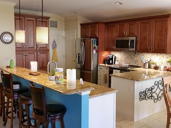 A must see! Paver drive and walkway. Kitchen has been entirely redone; Quartz counters, back splash, awesome cabinetry, breakfast bar, newer stainless steel appliances. Ceramic tile in the busy areas, two bedrooms have carpeting, one has laminate. Interior painted in 2016. Enclosed with full view acrylic windows in the lanai; paver patio. Garage has privacy screen, attic storage and insulated garage doors. HVAC replaced in December 2016. Architectural shingles. Termite bond. Make it yours today!
