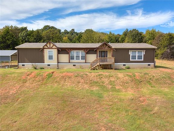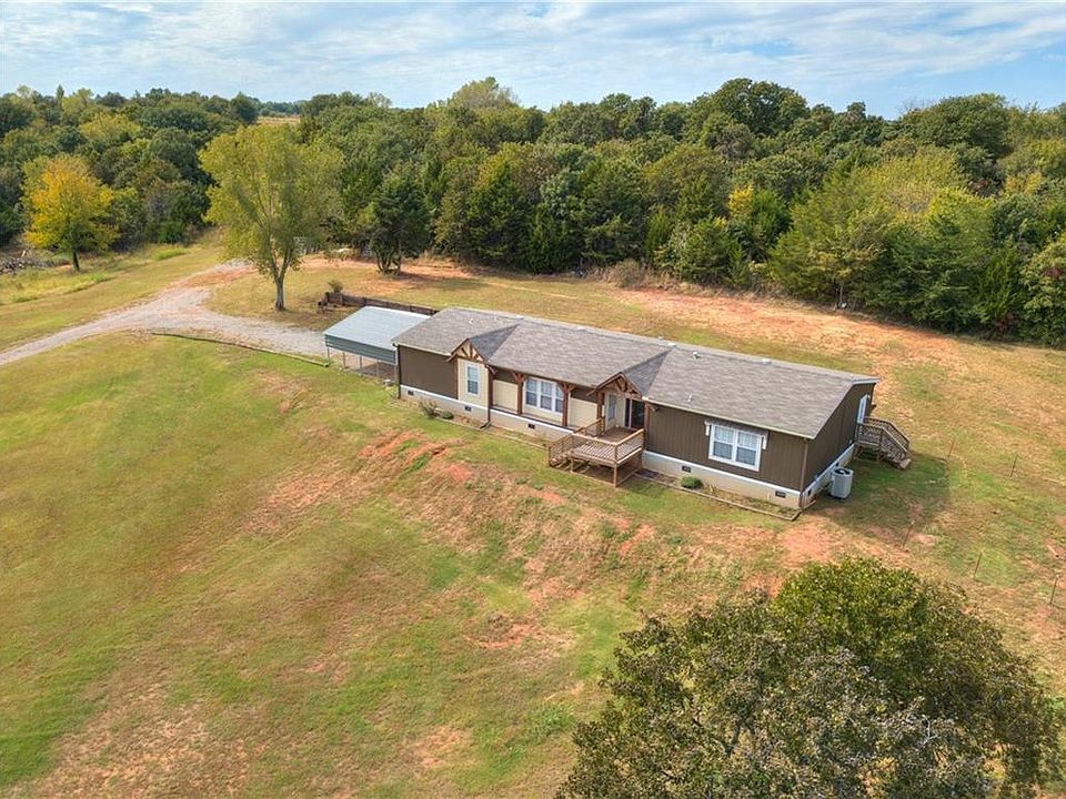 Modern farmhouse home situated hilltop on 5 private acres!! Large living room with a faux wood wall accent, opens up to a beautiful kitchen that features custom countertops, farmhouse sink, huge island with built-in microwave, extended cabinets for tons of storage and a built-in hutch with window seating that completes the dining room. Spacious master suite includes bathroom with walk-in rainfall shower, his and hers sinks, and a DREAM soaker tub nestled in front of it's own fireplace! Well-sized secondary bedrooms, one featuring built-in desk and shelves. In the laundry room you'll find ample storage and a custom dog wash. Enjoy peaceful country living from your covered porch or deck!! Come see what you've been missing before it's gone!