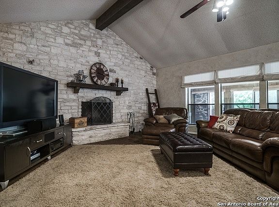 This house was built for entertaining. Large, vaulted family room offers decorative stone wall w/ nook that's perfect for a reading area or card table. Family room flows into enclosed porch (perfect for a man cave or separate living area) & then out to expansive deck & private yard. Corner culdesac lot has mature lawn & trees. Kitchen was recently remodeled w/ s/s appliances, solid wood cabinets and granite. Master bath offers great built-ins & large vanity. Flagstone patio. Stucco painted '14 w/ epoxy