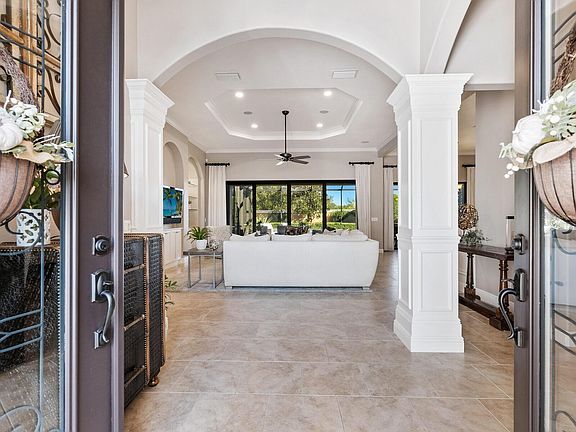 Set amidst impeccable lush landscaping evoking a paradise of elegance, this residence from John Cannon Homes is truly a masterpiece of Mediterranean style. Delight in coming home as you open the stately double doors to a grand living/dining room, with views of the captivating outdoor terrace, summer kitchen with sparkling pool. Marvel at the exceptional architectural details showcased throughout, with crown molding, tray ceilings, custom built-ins, ceramic tile, and wood floors enhancing the Mediterranean flair. Whip up signature recipes in the gourmet kitchen with custom granite countertops, wooden cabinetry, custom stone hood, stainless steel appliances and center island. The well-designed counter bar opens to a breakfast area with sliding glass doors, perfect for enjoying bright sunshine-filled mornings. The spacious master suite leads out to the lanai and boasts beautiful wood floors, separate walk-in closets, sitting area and lavish master bath. Two darling guest suites provide space for loved ones. Entertain with finesse on the outdoor terrace where an expansive covered sitting area makes lounging in the evening a lavish experience. Additional features include a stylish office, three-car garage, landscape lighting, designer interior lighting and window treatments, and impact windows. Within the LaCantera neighborhood of the area's premiere country club, experience the pleasures of a relaxed, curated lifestyle with two championship golf courses, fitness center, tennis, and a coveted social center.