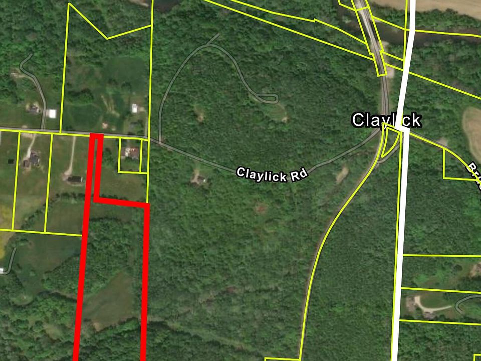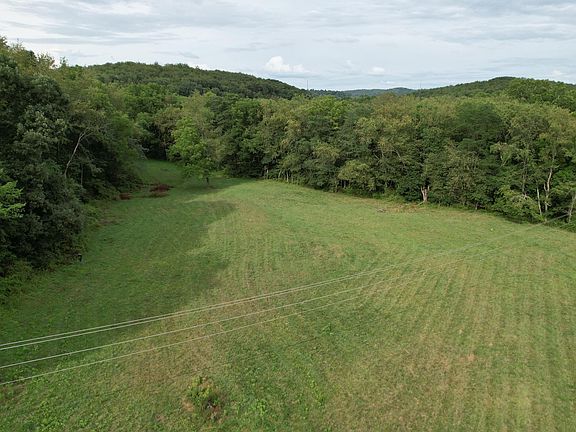 A creek runs through the property, with partial wooded areas and a hill offering a licking valley view, State owned property on one side, looking up to a cliff in back above creek and woods and hill to the other side.
