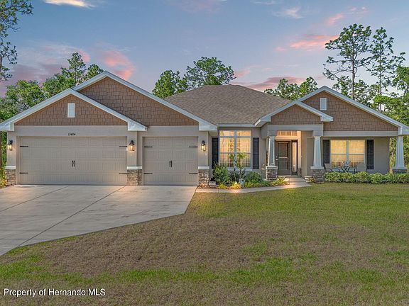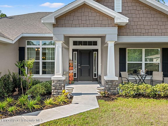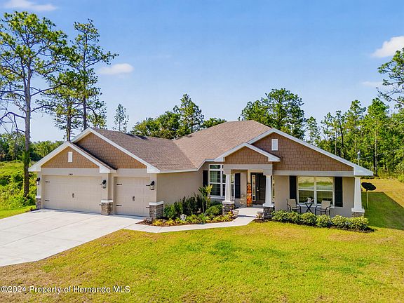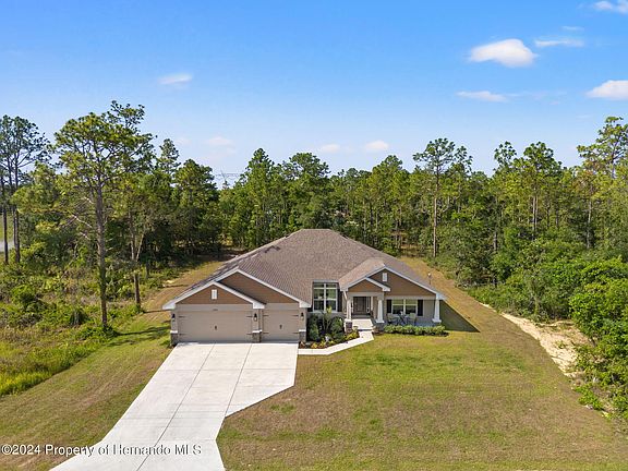 ACTIVE UNDER CONTRACT - ACCEPTING BACK UP OFFERS Discover Your Dream Home: a fantastic 4-BEDROOM, PLUS OFFICE, 3-FULL-BATHROOM, 3-CAR GARAGE treasure, located on a sizable lot just under a HALF OF AN ACRE. With curb appeal that's off the charts, this beauty is decked out with fancy accents, decorative columns, and stylish stone details, all tied together with a FRONT PORCH that screams ''WELCOME HOME!'' Built in 2023, this home has been given many upgrades since completion, and you'll enjoy the remainder of the builder's 10-year transferable STRUCTURAL WARRANTY. With a sprawling 2,508 square feet of living space and 2,908 square feet under the roof, this home offers plenty of room to roam. Step into the spacious living area, flooded with natural light and boasting lofty ceilings for an open feel plus NEW LUXURY VINYL PLANK FLOORING THROUGHOUT. The open-concept layout effortlessly connects the massive living room and formal dining area to the inviting kitchen and dinette space. Just off the entrance, discover double doors leading to a VERSATILE FLEX SPACE, perfect for a home office, den, or cozy movie nights. The kitchen boasts a breakfast bar, a fancy Cafe refrigerator with a deli-drawer, a sleek touch 2.0 faucet, stunning QUARTZ COUNTERTOPS, and a chic subway tile backsplash for that extra touch of style. The three guest bedrooms are smartly separated, with two sharing a guest bathroom towards the rear, and the third enjoying its own full bathroom towards the front. Prepare to be impressed by the spacious primary bedroom, featuring HIS & HERS CLOSETS, and a luxurious bathroom boasting double sinks, a garden tub, and a walk-in shower with a sleek glass door. Conveniently located off the kitchen, the indoor laundry room includes a newer LG front load washer and dryer, ready for your use. Step outside to your private retreat and enjoy the tranquility of your backyard from the comfort of the covered lanai. With a generous half-acre lot on a paved road, and NO FLOOD ZONE, HOA, or CDD fees to worry about, this property offers the ultimate in freedom and peace of mind. With Weeki Wachee's enchanting springs, scenic rivers, and charming small-town atmosphere right at your doorstep, along with easy access to the vibrant cities of Tampa and Orlando, this home offers the perfect blend of tranquility and excitement for your next chapter!