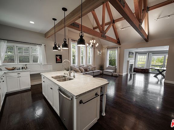 Located in sought after Dixie Canyon School District: In 2009 this custom home was rebuilt, and is positioned on the view side of Contour Dr. You enter into a spectacular twenty-five foot high lighthouse foyer and on to the soaring 2o-ft high wood truss-beamed ceiling in the Great Room.Warm & comfortable interiors feature dark wood floors & neutral wall colors. The gourmet kitchen features marble countertops, 8-ft center island, large breakfast/dining area appointed with oversized windows that provide an abundance of natural light. The living room features a classic fireplace and opens to an outside deck that overlooks the private, grassy backyard & mountain top views. The main level also features a powder and laundry room, 2 car direct-access man cave garage with 3 additional outside parking spaces, two secondary bedrooms and the Primary Suite with a walk-in closet and full bathroom. The lower level offers a multipurpose playroom and on to a large ensuite guest room. The lower level opens to the outdoor patio w/ full access to the spacious backyard ladened with fruit trees and foliage that is NOW in full bloom.