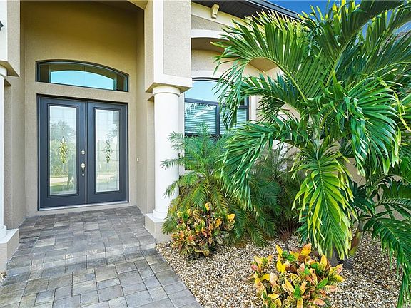 Built three years ago on a double lot, this immaculately-maintained home in South Gulf Cove was made to live your best life in South Florida. Inside, the home is expansive and open with a large living room, vaulted ceilings throughout, and soft, remote-controlled lighting in the living room and kitchen to set the ambiance you prefer. The sliding hurricane doors to the lanai open up an entire side and corner of the living room where you can step out to enjoy a dip in the pool which is fed by a small waterfall and built with a Pebble Tec finish. The tall doorways and luxury finishes make this home top of the list HOA participation is optional, and the home is built in the middle of two lots which are beautifully landscaped, and the built-in sprinkler system with well for water to ensure that the lawn and vegetation stay perfect year round. Behind the house are a variety of mature fruit trees and flower beds. The home is built with energy efficiency in mind, spray-in foam insulation protects this home from the heat and keeps energy costs low.