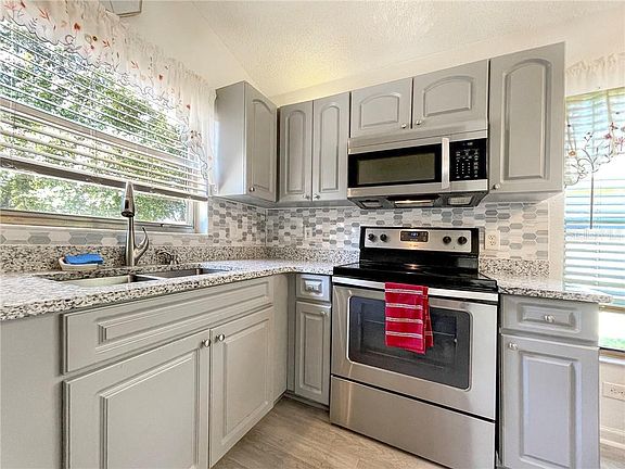 Welcome Home! This adorable 3 bedroom, 2 full bathroom, 2 car garage, 1432 square foot home situated in Ravenswood Village of Beacon Woods East is light and bright and features an open living room/dining room area, high vaulted ceilings, as well as an enclosed Florida room off the rear of the home for additional living space. The updated kitchen features modern gray cabinets, granite countertops, an updated tile backsplash, pantry, and a window over the sink that passes through to the exterior deck, perfect for entertaining! The eat-in kitchen has a breakfast nook with space for a table. The main living area of the home has laminate flooring, bedrooms and Florida room are carpeted. The kitchen and bathrooms have been updated with vinyl flooring for easy maintenance and also have newer vanities. Don't miss your chance to see this great home!