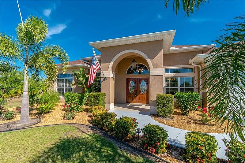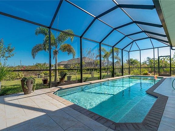 Prestine POOL home located in the desirable community of South Gulf Cove! 3 Bedroom PLUS a DEN with 12' ceilings, double glass doors, sliders, coffered ceilings, crown moldings, and tile throughout. Open/Split floor plan with breakfast nook, long breakfast bar, granite countertops, stainless steel appliances, 42" hardwood kitchen cabinets. Master bedroom looks out to large inviting screened lania and pool. Call for your private showing to view this beautifully landscaped home - New fence in backyard for additional privacy. South Gulf Cove features a nice community park and public boat ramp for access to the Charlotte Harbor and the Gulf of Mexico. Short car ride to Boca Grande and Englewood Beaches, golf courses, shopping and more.