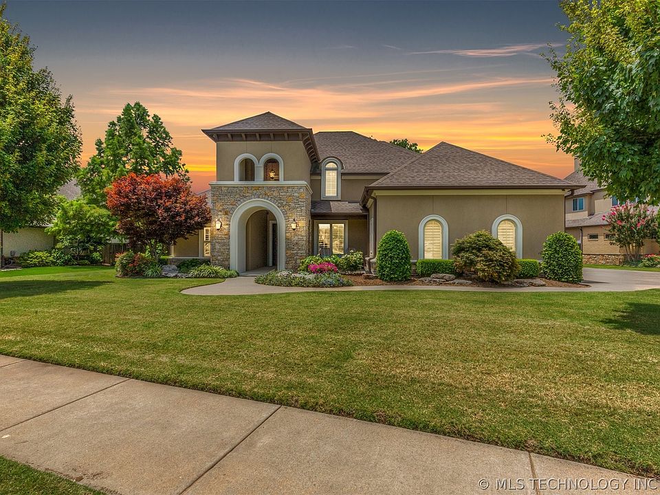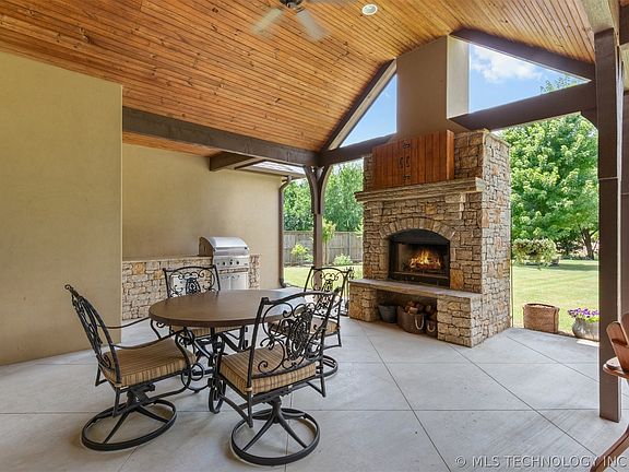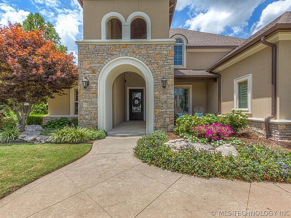 Stunning and meticulous, like-new home on an amazing lot in a gated Bixby North schools' community! Positioned on almost half an acre, the private backyard is a relaxing oasis, perfect for entertaining next to the outdoor fireplace, with a spacious covered patio and built-in grill. This estate home was built with the utmost attention to detail, with luxurious details throughout. The unique and open floor plan has everything, with an oversized 4 car garage, 4 spacious bedrooms, 2 of which are downstairs, a handsome home office, theater room, game room, large laundry room, mudroom and amazing storage throughout! Upon arrival, you will notice the grand scale and substantial wrought iron front door with the adjacent covered front porch, great for enjoying a morning cup of coffee, or watching passersby. Entering the home, the Brazilian Cherry Hardwood floors welcome you and flow throughout the first floor, with a gorgeous herringbone pattern adorning the entryway. Delightful crown moldings enhance the feeling of elegance, and the gorgeous stone fireplace is surrounded by beautiful built-ins. The bright and open kitchen features knotty alder cabinetry, built-in all fridge all freezer, double ovens, gas range flanked by pull-out spice cabinets and walk-in pantry. Unwind in the luxurious primary bedroom, with its spa-like en-suite and massive closet with seasonal storage. The amazing side-entry 4 car garage feels like an extension of the home, with lovely epoxy floors and so much space. The very large 4th car garage space is huge, at over 23ft long and 19 feet wide, with a 14ft high and 12ft wide garage door! Other features include cameras throughout the home, granite countertops throughout, all fully tiled showers, abundant storage space, large walk-in attic and a nearby neighborhood pool and trails.