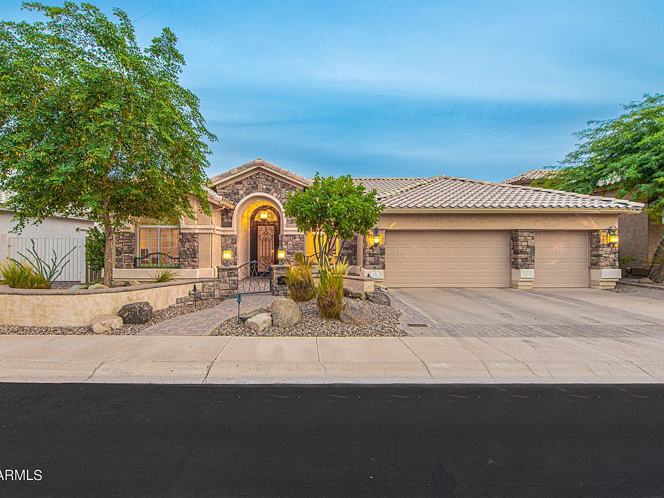 Outside you'll find a beautiful low maintenance backyard with a covered patio, sparkling pool and a fire pit. The 3 car garage has epoxy coating & attached cabinetry offering plenty of storage. Updates include a custom made iron entry door, fresh interior paint, 2 new AC Units, new pool pump & filter, new refrigerator & dishwasher and more.. Walking distance to top rated Kyrene Schools and in close proximity to some of the best hiking and biking trails in the valley. Book your private showing today!