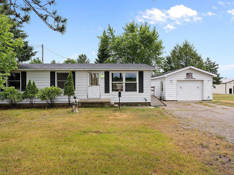 Stick built ranch home located on almost an acre just outside of town. This home offers open kitchen with dining area, 3 bedrooms and full bath with laundry. Detached garage, and 30x40 pole building with 12 ft walls for extra storage!