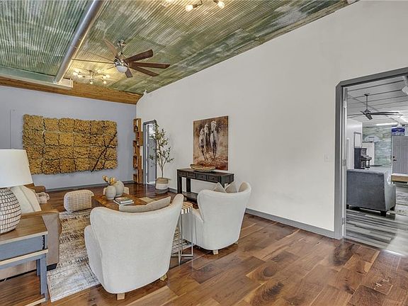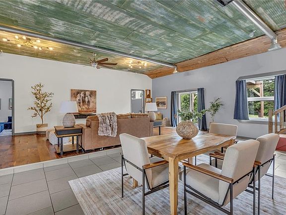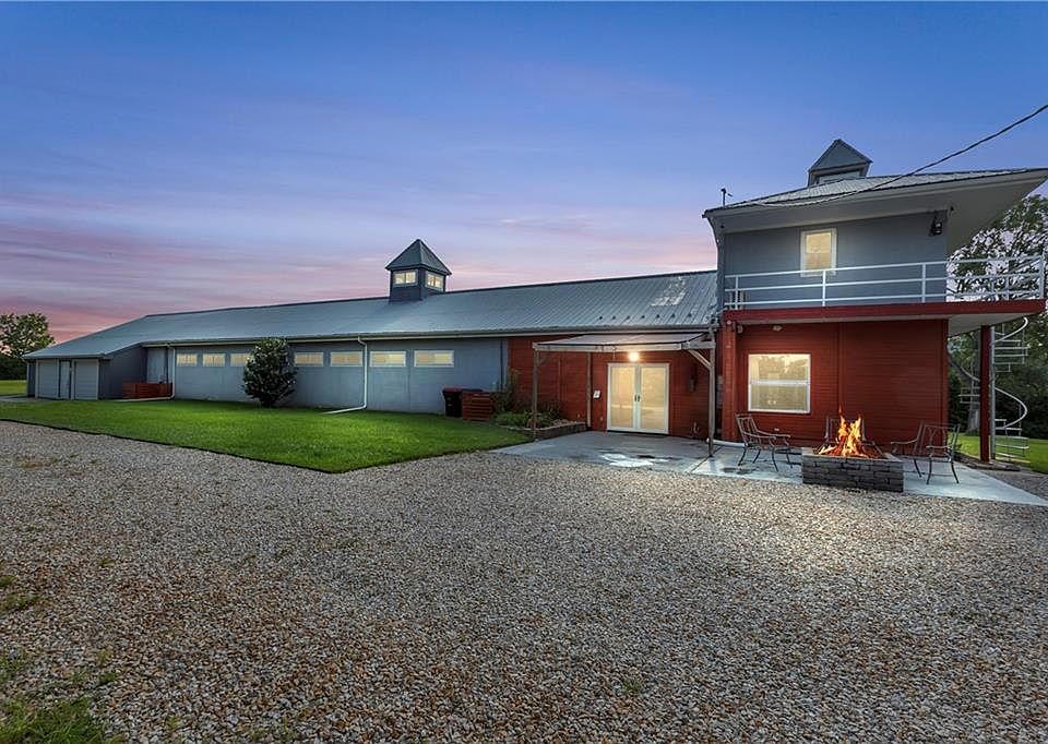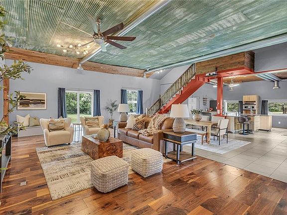 Welcome to your dream 1.5 story barndominium on nearly five serene acres! This modern-rustic home features a covered front porch with solar panels. Inside, enjoy an open living space with a cathedral ceiling and a projector in the living room that displays a stunning 16 feet by 10 feet picture, perfect for watching your favorite events. The living room flows into the kitchen and dining areas. The kitchen boasts a granite island with an induction cooktop, stainless steel appliances, a GE Advantium Speed Oven, and modern cabinetry. The dining area opens to a covered deck, ideal for relaxation. The main level includes a full bath with a soaker tub and separate shower. Beyond the living room, discover a family room with a vaulted ceiling, two spacious bedrooms, an office, and a recreation room, all with LVT flooring. A shared bath with a multi-jet shower head is perfect for pet washes. An expansive office space at the far end has direct access to a covered side patio and the adjacent garage. Upstairs, the owner's suite features custom wood inlaid flooring, a dual side wrap outdoor balcony with a spiral staircase, a walk-in closet leading to a tiled shower with a rain head, and an adjacent sink and laundry area. Across from the owner's suite is attic access, offering extensive storage with wood-covered flooring. Outside, enjoy a catfish stocked pond with a sunning deck, tree-lined privacy, and a gated entry. A spacious outbuilding serves as a garage and workshop, accessible via a paved path from the front door. All porches have solar panels ready for use. This barndominium blends luxury, comfort, and functionality, making it the perfect home.