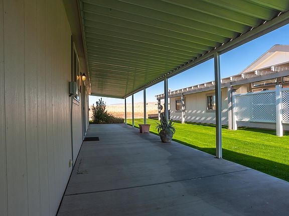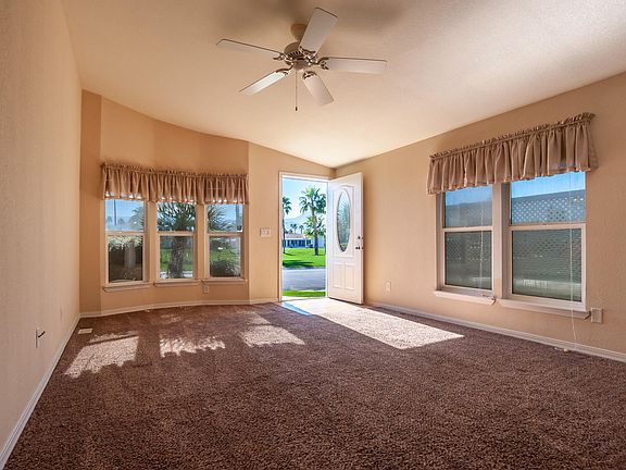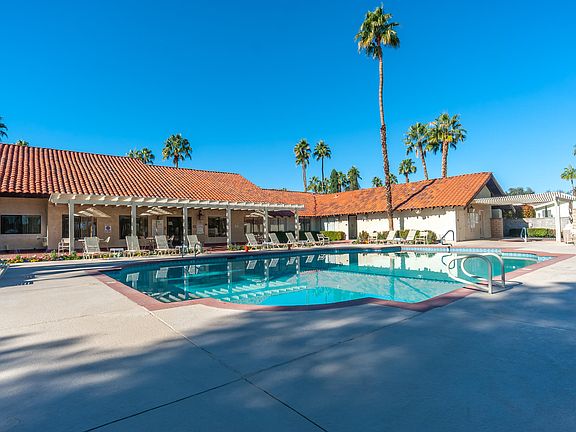 Located across the street from a large green space this 2 bedroom, 2 bath Skyline Oak manor home features a spacious Living room and dining room with carpeting, A Family Room with engineered wood plank flooring opens to a large semi-private covered patio. The engineered wood flooring continuies into the well equipped kitchen with GE white appliances; Gas range, Microwave, 20 cu. ft. Fridge with water filter, Disposal, Dishwasher.There's a Laundry room with washer, drier and additional storage area.The home features. 2 large bedrooms, owners suite has a walk in 60'' shower. Both bedrooms have mirrored doors to large closets. Hall bath has tub and shower.There are dual paned windows and window treatments throughout the home, and a solar exhaust fan in the Attached oversized 2 car garage with shelving for storage. The Desert Sands MHC features a pool and spa as well as peaceful water feature and a tennis court.