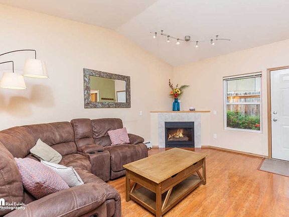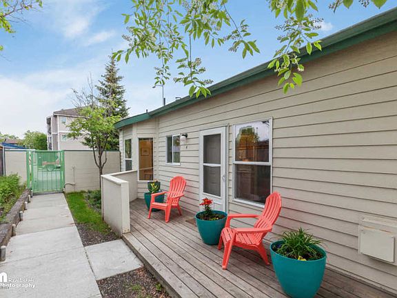 Comfortable ranch condo in turn key condition! End unit with new laminate flooring in bedrooms, vaulted ceilings, and gas fireplace. Attached heated garage with storage loft, laundry room with sink, dining nook with bay windows, pantry, and deck! Walking distance to AK Club, Bears Tooth, Organic Oasis, REI, Anchorage Cycle, Carrs and much more! 1/4 mile from trail system and minutes from downtown.