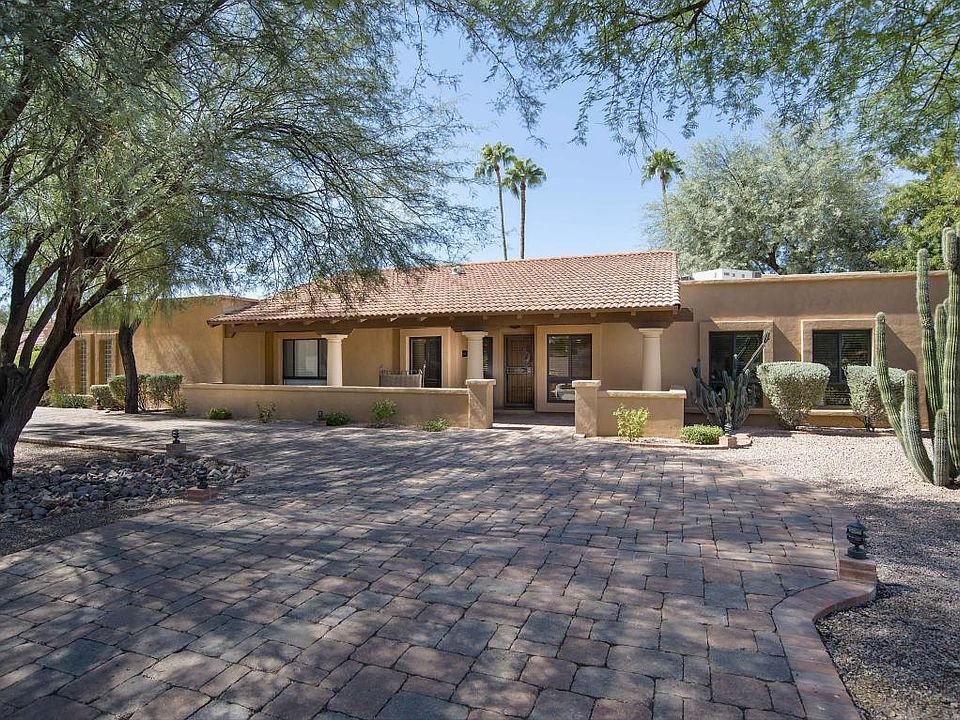 Wonderful family home in prime Scottsdale featuring:upgraded Italian lights, Italian tumble stone floors/hardwood, huge kitchen pantry, master bedroom expanded 480SF and includes his/hers walk-in closet. Enjoy the wonderful AZ sunsets in the hot tub adjacent to master. Spacious second bedroom suite has its own full bath. Resort back yard includes black pebble tec pool and new motor, lighted basket ball court and children's play area. The garage has abundance of built-in garage cabinets and workshop room with finished flooring and ceiling fan . Circular drive with pavers complete this turn key property. Freshly painted in/out.