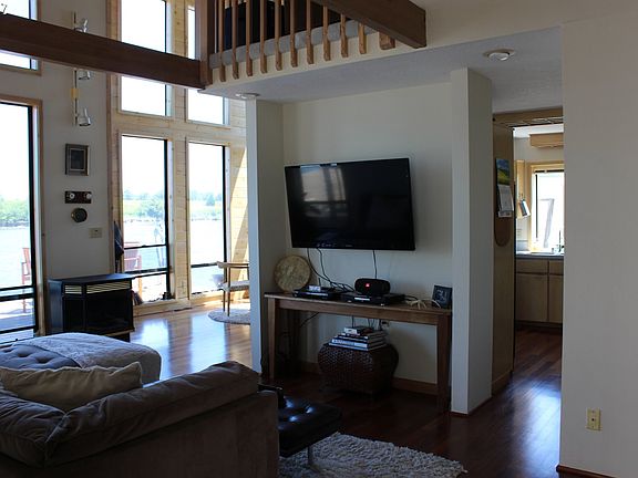 This is a great, custom floating home with a Sauvie-Island-facing wall of windows. The kitchen and living room downstairs have the benefit of the views as does the living room on the second floor. The sitting room in the 3rd story loft and the deck in front round out the amazing presence on the river.