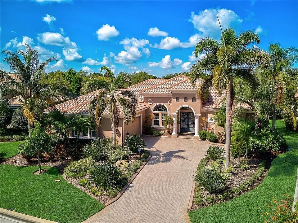 This spectacular home overlooks the #1 green on the Cypress Links golf course at Lakewood Ranch Country Club. Beautiful iron & glass San Marco front doors imported from Mexico welcome you into this wonderful residence. A spacious foyer leads you into the formal living and dining rooms with high ceilings and architectural features, including arches, built-ins, 7" crown molding and double tray ceilings. You will love the gourmet kitchen with it's 6 burner natural gas cooktop, granite counters, stone back splash & an abundance of cabinets. The kitchen also has a Bosch dishwasher, a built in desk and a breakfast nook. The spacious family room is open to the kitchen and has motorized sun shades (2022), a marble trimmed fireplace with an entertainment center & a tray ceiling. The sliding glass doors open to a fabulous oversized lanai with pavers surrounding a salt water pool with raised spill over spa. Outdoor kitchen installed in 2020; Pool heater replaced in 2020. The 2nd and 3rd bedrooms have custom closets; both bedroom have en-suite baths. The den/study is located in the back of the house overlooking the golf course and includes a built in desk & plenty of built-in cabinets. Plantation shutters throughout the house. The primary suite is spacious and offers a lovely sitting area, professionally designed walk in closets & large bathroom with dual sides. Jacuzzi marble trimmed bathtub and massive 2 way walk-thru rain shower. The oversized two car garage with epoxy non skid floor has a separate golf cart entrance and an extra air conditioned storage room. The laundry room features Speed Queen commercial washer and dryer (2018). Lennox air conditioner installed in 2019; air ducts were professional cleaned in 2022. Sonos surround system and in-wall pest control system. Exceptional curb appeal with motion detecting outdoor security lights and night lights. Mature landscaping in the front and the back of this magnificently appointed home. Country Club at Lakewood Ranch is a social gated community with optional golf and country club memberships. Conveniently located near I-75, the UTC mall, shopping, fabulous dining & entertainment. Short drive to the beautiful Gulf Coast beaches, SRQ International Airport, downtown Sarasota, and so much more. Come live your best life in what has become one of the Nation's favorite places to call home, Lakewood Ranch Country Club! Room Feature: Linen Closet In Bath (Primary Bedroom).
