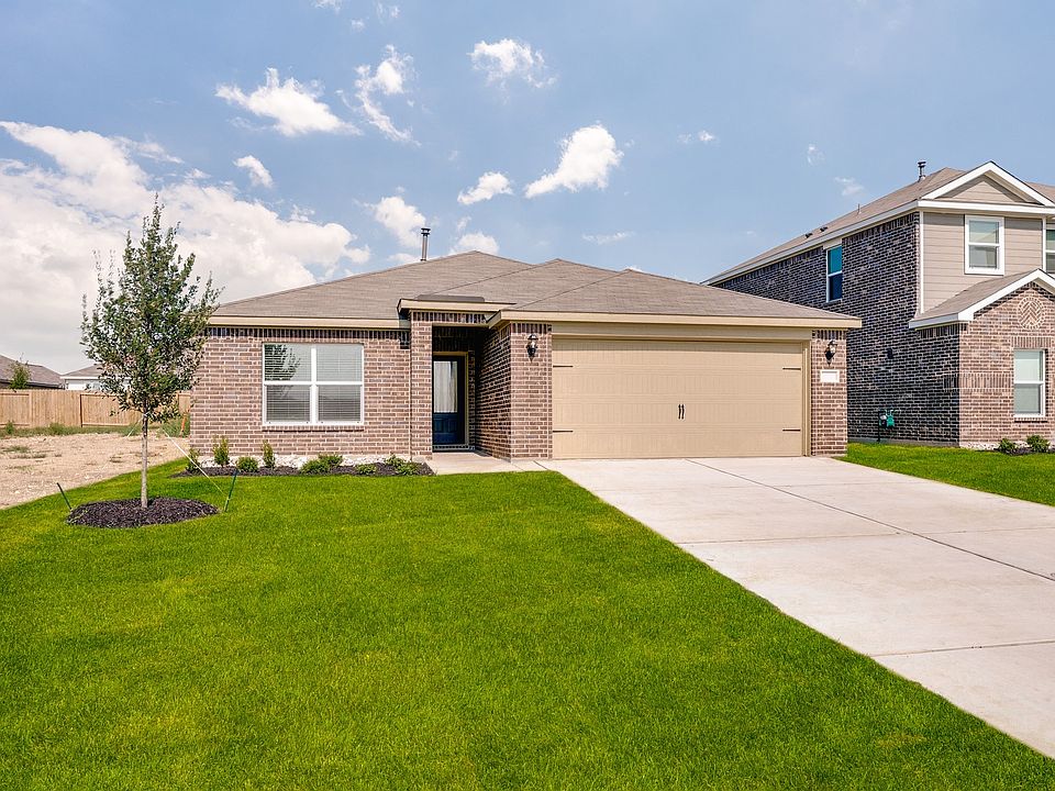 The Ashton is a beautifully designed one-story home featuring three bedrooms, two bathrooms, and a charming brick exterior with a welcoming covered porch. Inside, the open-concept layout seamlessly connects the kitchen, dining, and family rooms, perfect for everyday living and entertaining. The attached two-car garage provides convenience and protection from the elements, while also offering extra storage space. With spacious bedrooms and a thoughtfully designed layout, this home blends elegance, comfort and functionality for the perfect living experience.