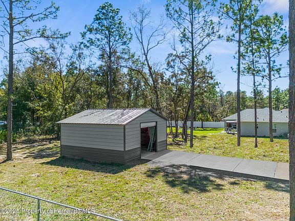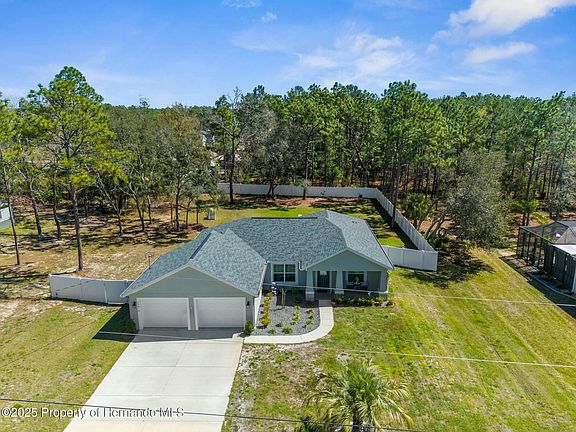 AMOST BRAND NEW Craftsman-style 3/2/2 Home + Detached Garage (20x20) on DOUBLE LOT in beautiful Royal Highlands!! Built in 2023 and MOVE-IN READY, this METICULOUSLY MAINTAINED home offers 3 bedrooms + 2 bathrooms + 2 car attached garage + detached garage + fenced in yard with fire-pit + large covered screened in back porch + front porch + DOUBLE LOT which is almost an acre total (.92 of an acre)!! Everything is basically new in 2023 (ROOF, AC, plumbing, electrical, fixtures, everything!) NO FLOOD!! NO HOA!! Bring your RV, camper, boat, ATVs, toys, pets...bring it all!! Zoned for the newest schools...Winding Waters (K-8) and Weeki Wachee High School!! Open floor plan and high ceilings make this home feel light, bright, and spacious!! Upgraded Kitchen with granite countertops, white cabinets, stainless steel appliances! Kitchen is open to the dining room and the great room! Glass sliders to the covered, screened in, back lanai/back porch!! Split floor plan offers privacy for the master suite! Master has ensuite bathroom with granite countertops, white cabinets, walk-in shower and large walk-in closet. Come see this incredible outdoor space!! What a large backyard! Completely fenced for your family and/or pets! Beautiful circular rock fire-pit for entertaining or enjoying the evenings outside!! Oversized rear covered porch has block half wall and is screened-in. Large open patio with pergola! Outdoor sink! Large detached garage (20x20) with concrete floor, concrete driveway, electric, roll up door and side entry garage do give you an incredible amount of extra space on your property!! Located in Royal Highlands! Close to rivers and springs for kayaking and swimming with the manatees, dinning on the river, grocery shopping! 1 hour north of Tampa Bay with easy access to Tampa International on the Suncoast Expressway!! Come see it today!