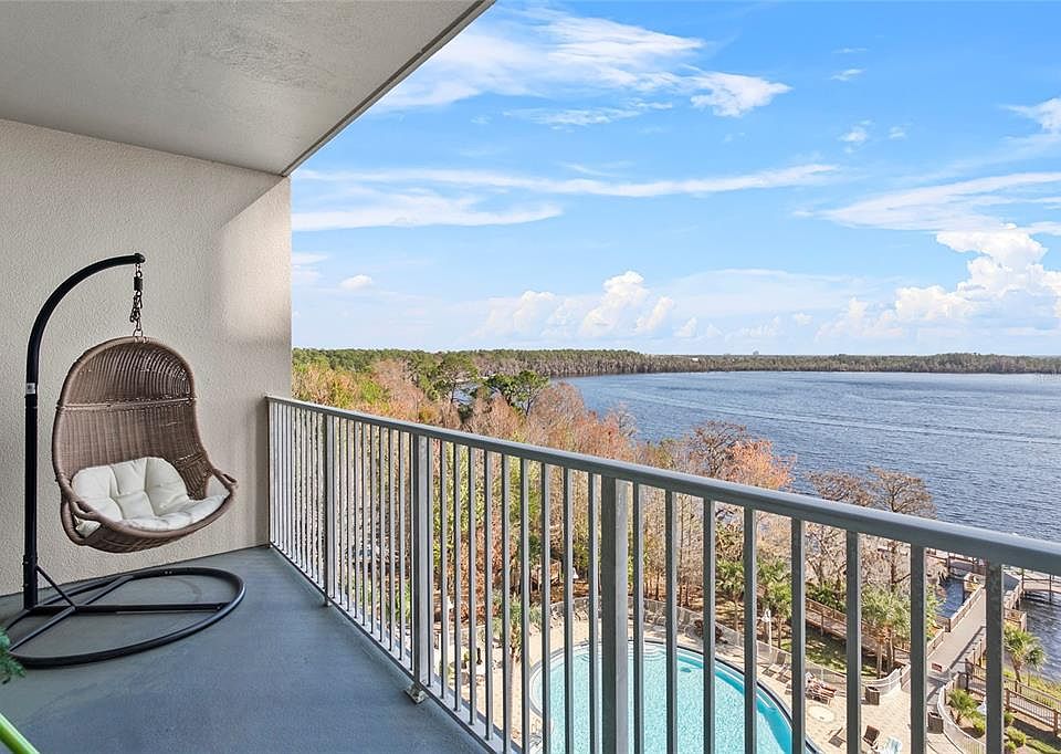 Boat dockModern finishesResort-style poolPrivate balconyHot tubDisney fireworksOpen-concept unit
