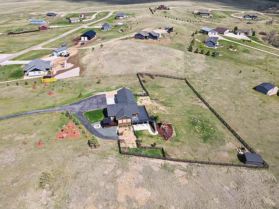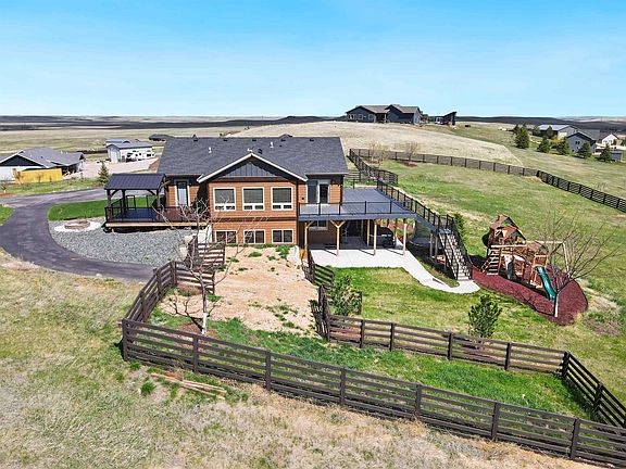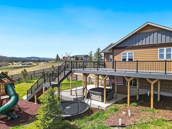 You'll love the views from the massive back deck! This gorgeous home is situated on a 3 acre lot in Timberwood Park Estates. The back yard is entirely fenced including a separate dog run. The walkout basement leads to a large patio with a hot tub connection. The master suite features dual vanities and a nice tile shower. The master suite has direct access to a private deck with views of Bear Butte. The large gourmet kitchen features ample storage, a farm sink, double oven, a large island, and granite countertops. The garage has a gas line for a heater, floor drains, extra storage racks, and hot and cold hose spigots. It's prepped for a utility sink drain as well. The basement level has bedrooms 3 and 4 as well as the second full bath. The family room has a theater setup with wet bar as well as room for a pool table. The driveway is all asphalt and lined with trees. This one is sure to check the boxes on a lot of your "must haves"!