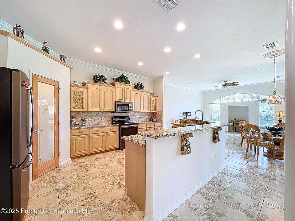 This is a beautiful home, in desired Pristine Place,priced to sell...Step into timeless elegance and modern convenience in this beautifully updated custom built home, where no detail has been overlooked. From the moment you arrive you will be greeted by full leaded glass panel entry doors with side lights, classic pillars, and a tiled accented front walk and porch that set the tone for what's inside. Inside enjoy the warmth of brand new Smart Core Ultra wood laminate flooring in the formal living and dining rooms, as well as all 3 bedrooms. Crown molding throughout the home has just been done to add a touch of sophistication. An open and inviting kitchen shines with new granite countertops featuring protective Nano ceramic coating, a commercial-style undermount sink & faucet. Travertine tile flooring in the entry foyer through the halls, kitchen, and all 3 bathrooms. Double glass paneled doors lead from eat in kitchen area to the tiled screened in lanai. Custom windows , arched doorways, and vintage inspired light fixtures reflect the homes unique design and attention to detail. Built with accessibility in mind, this home features extra wide hallways, a wheel chair accessible shower in the primary bath with handicap safety bars, a 48 inch wide sidewalk, and a portable ramp from the over sized 2 car garage to the dining room. Complete interior and exterior painting done 2024.