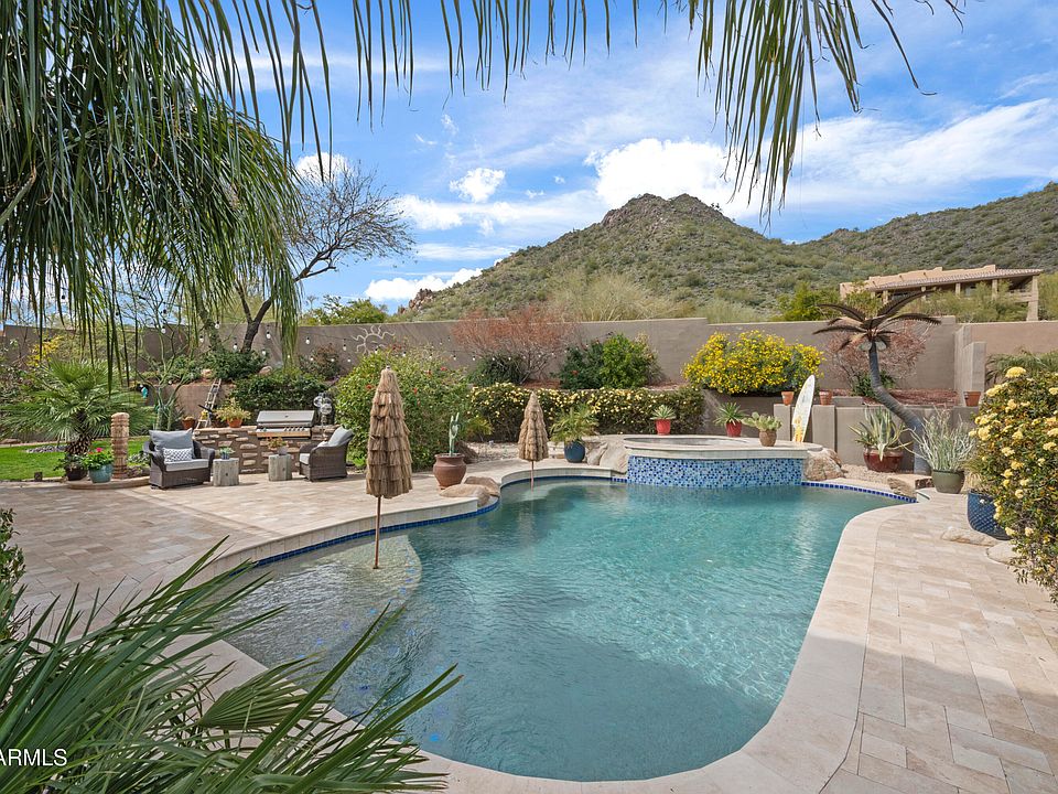 Sparkling poolCovered patioLush landscapingBreathtaking mountain viewsFresh exterior paintPrivate resort-style oasisExpansive windows