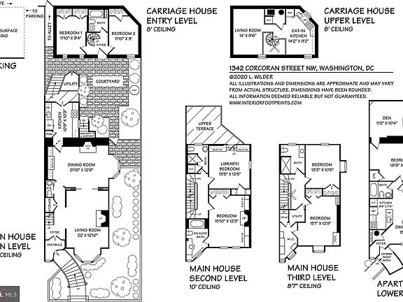 Rare opportunity to own a pristine semi-detached Queen Anne Victorian rowhouse with a 2-story rear carriage house and a lower-level apartment in the main house (both providing rental income) for a total of 7 bedrooms and 5.5 baths, PLUS 2 parking spaces and an abundance of private outdoor living space -- all on a charming tree-lined street in prime Logan Circle/14th St location just 1 block to Le Diplomate and 3 blocks to Whole Foods. **** Main house comprises 3 levels of generous above-grade living space with 4 bedrooms, 3.5 baths, 3 fireplaces, 2-zone heat/AC, Sonos system, hardwood floors, high ceilings, restored original architecture/details, tasteful modern amenities, formal living room and dining room, bedroom/library with French door to private upper terrace, and updated kitchen with French doors to rear private courtyard. **** Lower-level flat in main house is a 1 bedroom PLUS den with full bath, kitchen that opens to living/dining space with fireplace, in-unit washer/dryer, fresh paint, new carpet, and its own heat/AC system. **** Two-story carriage house has 2 bedrooms, full bath, kitchen that opens to living/dining space, in-unit washer/dryer, hardwoods, fresh paint, new carpet, and its own heat/AC system. **** Set back from the street, this magnificent one-of-a-kind property features more outdoor space than the typical DC rowhouse and boasts professionally landscaped front yard and side yard, a private upper terrace with potted plants/trees, and a sizeable rear brick courtyard walled off from the street for complete privacy, with garden beds, trees, professionally designed lighting, and gated access to the side yard and to the rear alley where there are 2 surface parking spaces. **** Certificate of Occupancy is for 3 residences. Endless possibilities mean you can live in 1 residence and rent the other 2; or rent all 3; or keep all 3 for yourself and use the lower apartment and carriage house for au pair/in-law suite, home office, Zoom room, home gym, etc.