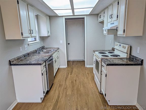 3 bedrooms, 2 baths, 2 car garage, great closets, vaulted ceiling, new interior and exterior paint, vinyl wood-like flooring. Recent total remodel. Ready to move it! New roof will be installed before closing/ Perfect starter home or investment property. Conveniently located close to Tulsa Riverparks and Tulsa HIlls, walking trails, highways, shopping, and restaurants. Home warranty included! Listing agent is the owner.