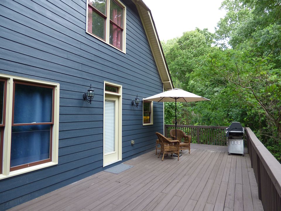 Gorgeous Craftsman 4 bedroom, 3 1/2 bath home plus home office and finished basement! Shady wide front porch, spacious living room with fireplace, beautiful hardwoods and crown molding throughout. Entertainer's kitchen with stainless appliances, granite island bar and counter tops opens to a the large wrap-around deck, shaded private fenced lot. Large guest suite on main with full bath and walk-in closet, large master upstairs with spa bath, huge walk-in shower and jetted tub. Terrace level completed with separate kitchen, rec room, laundry, bedroom and storage.