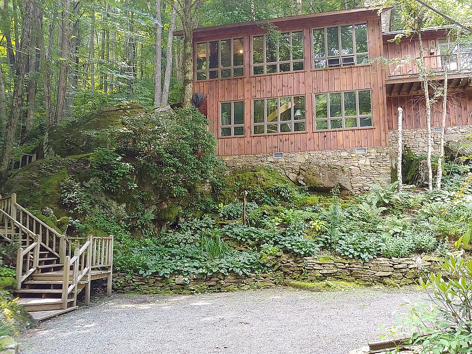 Located on a steep sloping lot, beyond a private bridge spanning Winter Star Creek, containing 1.9 acres and 182 feet of creek frontage. This one of a kind home was built in 1995 by Dallas Morgan, a local craftsman specializing in the use of reclaimed wormy chestnut lumber. The upper main floor consists of a great room which includes kitchen, dining, stone fireplace and sitting areas, guest bedroom with bath and master bedroom with bath including a jacuzzi. The great room and kitchen area have a vaulted ceiling with floor to ceiling Anderson windows. The great room walls and all cabinets throughout the upper floor feature wormy chestnut reclaimed by Dallas Morgan. There is a wet bar in the kitchen area. The laundry area is located near the master suite. The back door to the main floor is in the rear and opens out on a large deck with a covered cooking area. The front entrance opens into the lower area which has floor to ceiling Anderson windows, wormy chestnut walls and cabinets. This entrance has a seating area and a wet bar. Access to the upper floor is by a spiral staircase. There is a stone patio surrounded by massive rocks opposite the front entrance. There is a spacious crawl space area that contains the gas furnace, water supply, a small office and a large storage area that opens out to a large deck with access to the car port. All new appliances and heating system replaced in the last 5 years.
