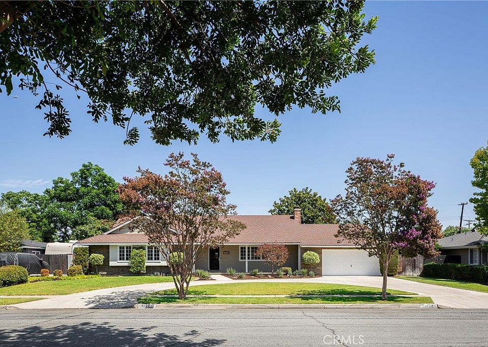 Welcome to this charming single-story ranch home, situated on one of North Tustin’s premier streets, surrounded by large lots and pride of ownership throughout the neighborhood. A half-circle driveway, covered front porch, and attached two-car garage create a welcoming entry. Inside, the spacious family room features a fireplace and expansive windows overlooking the front yard. At the heart of the home, the dining room offers a second fireplace and opens seamlessly to the remodeled kitchen with wood cabinetry, marble countertops, stainless steel appliances, and a sink overlooking the backyard. Just beyond, a versatile living room at the rear provides flexible space for a playroom, office, gym, or lounge. The bedroom wing includes two secondary bedrooms at the front of the home, which share a full bathroom with dual sinks and a bathtub. The primary suite is tucked at the back, complete with French doors to the backyard, an en suite bath, and a walk-in closet. Additional highlights include a freshly painted interior, dual-pane windows, an updated roof, hardwood flooring throughout, and a laundry room with a convenient half bath. Mature landscaping enhances the expansive lot, creating a private setting with plenty of room to enjoy. Located within the sought-after Tustin Unified School District and served by Foothill High School, this home also offers excellent access to the 55, 22, and 5 freeways, making for an easy commute across Orange County.