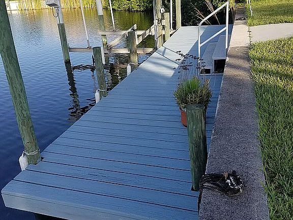 Completely renovated waterfront home in South Gulf Cove. This spacious home features an open floor plan with great views and plenty of natural light. 20" x 20" porcelain tile throughout living area. 3 bedrooms with brand new carpeting. 2 full bathrooms include granite countertops, bronze & stainless steel fixtures as well as recessed lighting. Oversized great room with pool access, leads into open kitchen area. Kitchen is completely renovated with top of the line stainless steel appliances, island and granite countertops. Den features laminate wooden floors and bay windows. Master suite includes double sliding doors with waterway views, large walk in closet and master bath with double sinks. Homes stays cool with new low E impact windows installed in 2013 and metal roof in 2005 with a new 16 seer AC in 2015. Utility building located in the back yard has electric. 16' x 30' salt water pool with outdoor shower and covered lanai area with pocket sliders. This home is open for entertaining our just a quite evening with an awesome view. Located on the Santa Cruz water way with a sea wall, dock that has water and electric and a 6K boat lift. Don't miss the opportunity to own water front in paradise! Call to see this home for yourself!