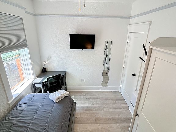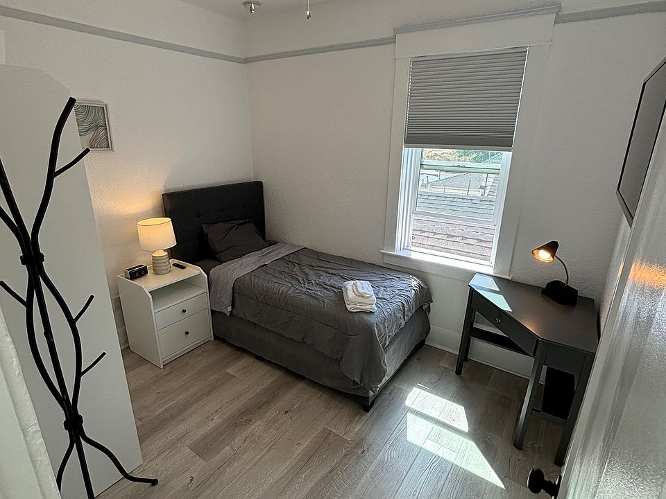 Furnished bedroom (5C) is in Apartment 5 on the second floor. This is a four bedroom unit with hardwood floors and high ceilings. 5C has a twin bed offering downtown city scape views. Note: one person per room only.
