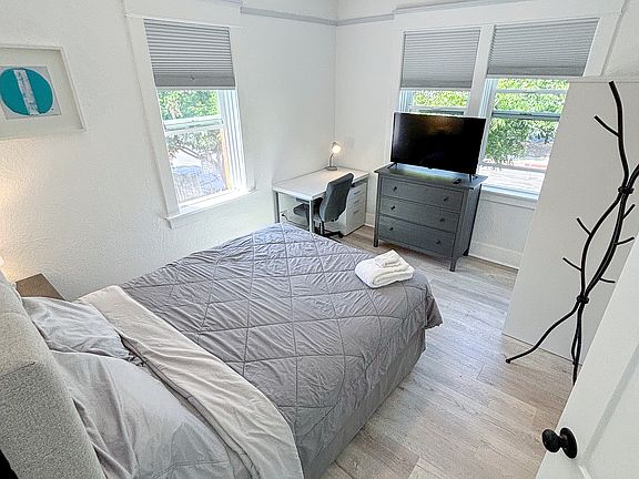 Bedroom (5B) is in Apartment 5 on the second floor. It is a fully furnished four bedroom unit with hardwood floors and high ceilings. Furnished private bedroom (5B) is a large corner space with a full bed offering downtown and City campus views.