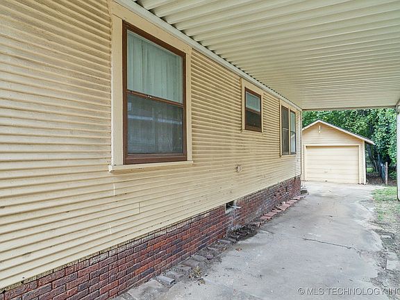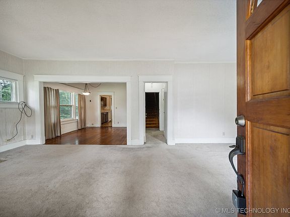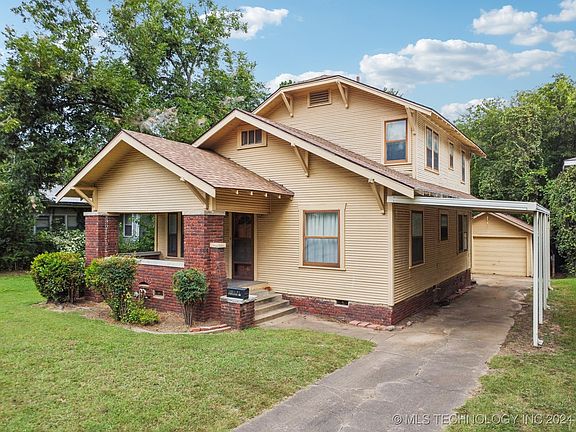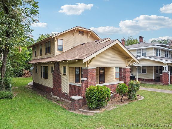 Price Improvement, dropped $5000. Discover the charm of this delightful two-story bungalow located in the heart of Okmulgee. This 3-bedroom, 2-bathroom home offers vintage character. Relax and enjoy your morning coffee on the inviting front porch, perfect for quiet moments or entertaining guests. The main floor boasts a formal living room and dining room, both with hardwood floors—refinished in the dining room and preserved under carpet in the living room, ready to be revealed. The kitchen adjoins a cozy breakfast nook adjacent to the laundry room, providing ease and convenience for daily living. The primary bedroom is located downstairs, just steps from a full hall bath, ideal for single-level living if desired. The second floor can be closed off for privacy or accessed via stairs, featuring two large bedrooms, a full bath, and a spacious bonus room—perfect for a home office, playroom, or additional living space. Home was replumed and new sewer line installed in 2020. New gas line and electric hot water tank installed in 2022. New roof installed in 2019 on both home and garage. Central HVAC system serves the main floor. Conveniently located near schools, parks, and shopping. Quick access to local highways for easy commuting. This home offers plenty of space and tons of character.