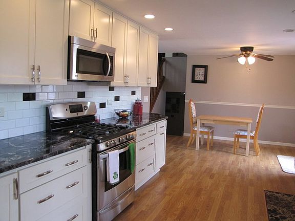 Quiet street for this fabulous four bedroom two bath home. New kitchen boasts white cabinets, granite tops and stainless steel appliances. Walk out the kitchen sliding glass door onto the large deck which overlooks over sized, tree lined fenced in yard. Yard also includes a large shed. This nice and clean home contains bedrooms with hardwood floors, oak doors and staircase and a walk out lower level with fireplace. Located near shopping, restaurants, schools and parks.