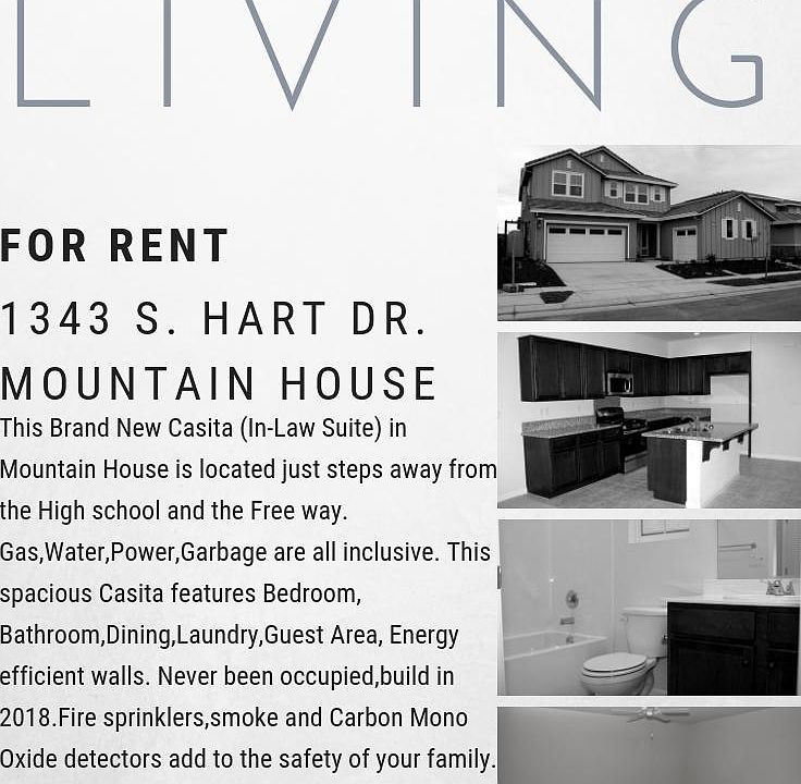This Brand New Casita (In-Law Suite) in Mountain House is located just steps away from the High school and the Free way. Gas,Water,Power,Garbage are all inclusive.Separate Garage. This spacious Casita features Bedroom, Bathroom,Dining,Laundry,Guest Area, Energy efficient walls. Never been occupied,build in 2018.Fire sprinklers,smoke and Carbon Mono Oxide detectors add to the safety of your family. Gas,Power,Water,Garbage included in rent.