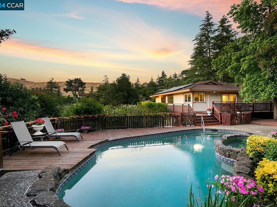 FIRST TIME ON MARKET IN 45+ YEARS! Perched atop Lafayette's Springhill neighborhood, this light-filled home with stunning views is just waiting for your personal touches to update it to perfection or live in it right now as-is and renovate as time & budget allow. Soaring ceilings gorgeously defined by dramatic wood beams, two living rooms, dine-in kitchen, dedicated laundry room, central HVAC with NEW Heater & AC unit, and fabulous wrap-around deck for perfect indoor/outdoor living. 4 beds/2 baths on the main level, plus large 5th bedroom or playroom & full bath on the lower level with easy sliding door access to the sparking swimming pool & large party hot tub from both levels. Primary suite has generous walk-in closet and double sinks. Oversized two-car garage plus wonderful bonus additional upper parking for 6+ cars, low maintenance landscaping, and leased Solar. Just minutes away from top-rated schools, hiking trails, Springbrook Swim Club, downtown Lafayette, BART, & Hwy 24