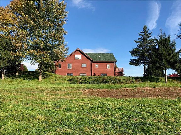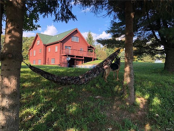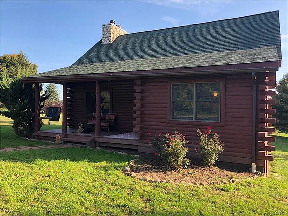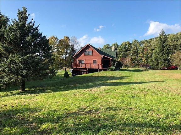 Situated on approx. 9 acres this stunning log home is the perfect spot to unwind at the end of the day. Natural woodwork throughout, vaulted ceilings, exposed beams, massive wood burning stone fireplace and a first floor bedroom that boasts sliders which lead to a spacious deck with spectacular country views. Open loft currently being used as a hobby/sitting area could be bedroom . Full finished walkout basement. Central A/C---- Combination oil/wood burning furnace provides economical heat source. There is a huge pole barn with updated electric, 12 x 9 overhead door, workshop and attached 12' x 25 ' lean too for all your recreational vehicles. Special touches throughout make this home unique with the conveniences that make life comfortable. A rare find!!