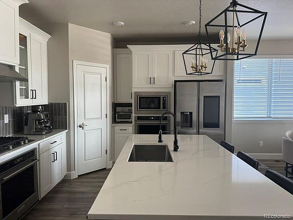 Discover contemporary elegance in this single-story, open-concept masterpiece backing to serene open space with stunning wildlife views. Built in 2023, this home blends sleek modern design with farmhouse charm, featuring a spacious open floor plan ideal for entertaining. The gourmet kitchen, equipped with energy-efficient appliances, two ovens, and a 5-burner gas stove, soft close cabinets, slide out shelves, flows seamlessly into the bright living and dining areas, boasting high-end finishes, abundant natural light, and stylish window blinds throughout. Enjoy a low-maintenance, professionally landscaped yard, a covered back patio with maintenance-free vinyl decking and a retractable side privacy shade for added seclusion. The home also includes a 3-car garage with epoxy-coated floors and a gas heater on its own thermostat for those cold Colorado days, plus a tankless water heater and a programmable Wi-Fi thermostat for optimal energy efficiency. The full unfinished basement, with bathroom rough-ins, offers endless potential for customization. Located in a prime, sought-after neighborhood, this ranch-style retreat offers easy, stair-free living with unmatched style and tranquility. The kids will love the abundance of parks in Meadowlark, just in time to enjoy the splash pad, and the nearby Cherry Creek Regional Trail, offering 45 miles of scenic, mostly paved paths perfect for biking, walking, or horseback riding through Denver, Arapahoe, and Douglas Counties, connecting to Cherry Creek State Park and Castlewood Canyon State Park.