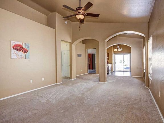 Impress your guests with the Stately Stacked Stone on this adorable 3 Bed + pool in Dreaming Summit. Enjoy ALL NEW CARPET and charming archways throughout the home. Spacious Living Room opens to the Dining Area. Cheery Kitchen has a sliding door to the Pool Area. Beautiful honey cabinets and pantry for storage. Grand Master Suite has private full Bath with double sinks. Plus, a walk in closet. 2nd and 3rd bedrooms are split by a 2nd Full Bath. Splash your cares away in the Pebbletec Pool with lounging step and BB hoop. Covered patio with fan for lots of shade. 2 car attached garage. Security Door for cool breezes. Easy care desert landscaping greets guests. A Charmer!