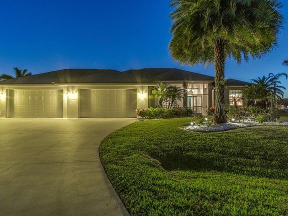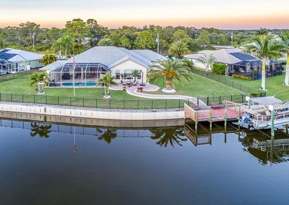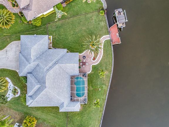 Looking for an elegant home with entertaining in mind? Your guests will be envious of this meticulously maintained waterfront home! Its custom design is meant to appreciate the waterfront location with 160ft sea-walled water frontage, harbor & gulf access. Large windows accentuate a spectacular view of the waterfront, and sunsets that'll never get old. Full pocket sliders expand the living space allowing full access from the living room to the large lanai. Newly installed wood flooring in the living room, dining room, family room and master suite compliment nicely with the ceramic tile flooring. You will love the spacious master suite with separate His and Her master baths, double vanities, soaking tub, walk-in shower, and pool access door. Aquarium windows, saltwater heated pool, dinette area and well-equipped spacious kitchen with, pantry closet, granite counters, granite bowl composite sink, stainless appliances (2017). The 2 split design guest bedrooms have easy access to the third bathroom. A laundry room with cupboards, utility sink & two full-size closet/pantries. The yard is nicely landscaped with a private well for irrigation. A large brick paver patio, with 50 foot brick paver walkway leads you to the private boating dock and lift. Fenced back yard with newly installed 280 feet of 4 foot high aluminum fencing. The 4 stall garage is 26ft deep, 930 sqft. A/C (2017). Pool Heater (2019). Be sure to click and watch the virtual tour #1 to capture the full details with your own eyes.
