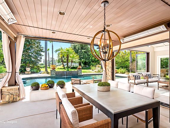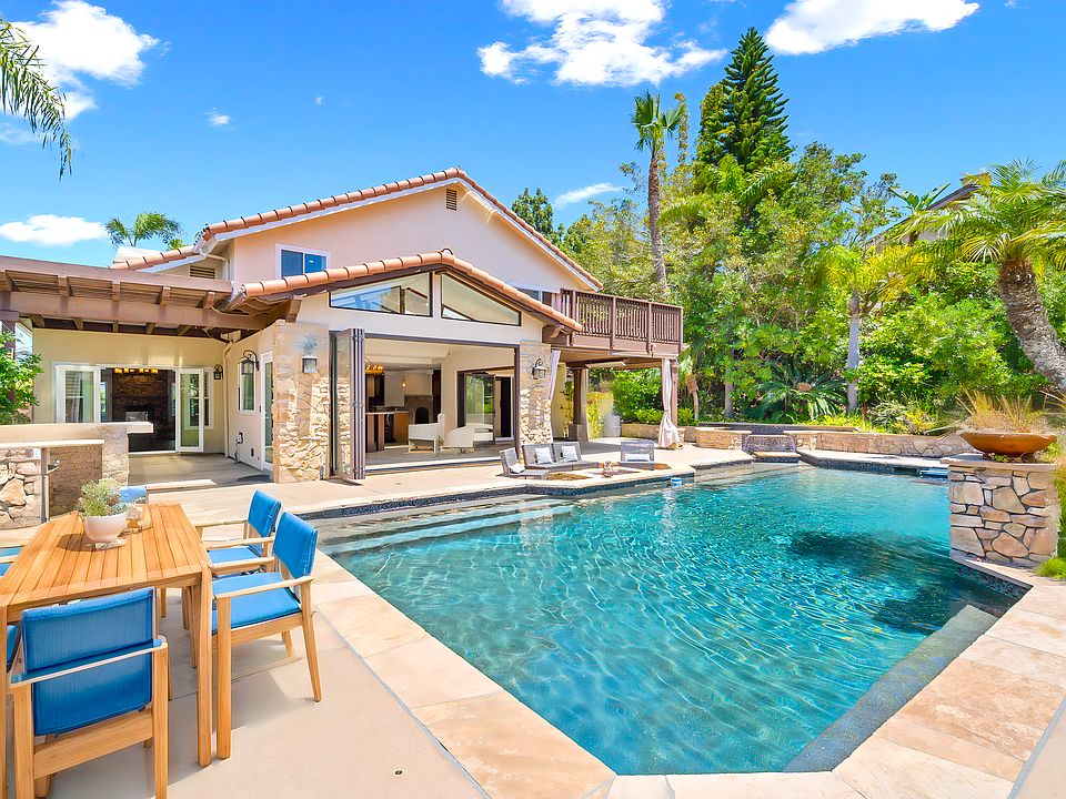 Canyon Views and Resort Style Living! This home offers an entertainer's paradise with a heated pool featuring a waterfall, jacuzzi, endless pool for lap swimming, built-in BBQ, outdoor fireplace, covered patio, and gazebo all overlooking tranquil west-facing canyon views with peak ocean glimpses. Positioned on a nearly half-acre lot with stunning west canyon views, the zen-like landscaping enhances the serene atmosphere, creating the ultimate private outdoor retreat. Cantina doors open directly from the kitchen to the backyard, creating a seamless flow for entertaining. Whether you're hosting poolside dinners or enjoying peaceful canyon sunsets from the balcony, this home is designed for year-round enjoyment of Southern California's climate and lifestyle. Luxurious Layout with Dual Guest Suites and Gourmet Chef's Kitchen. 5 bedrooms and 4.5 baths over 3600 sq ft, the home features two main-level guest suites (one with private entry), perfect for multi-generational living or visitors. The chef's kitchen boasts a six-burner stove, double ovens, extended island, cantina doors for indoor-outdoor flow, and high-end finishes like granite counters and stainless appliances. Upstairs, the master suite offers a cozy sitting area with a fireplace, a large walk-in closet, a built-in vanity, a deep soaking tub, and an oversized shower. Step out onto the spacious balcony to enjoy peaceful views of the pool and canyon. Situated on a quiet cul-de-sac in a top-tier school district, this home combines privacy and accessibility just minutes to Pacific Highlands Ranch Village, One Paseo, top schools like Torrey Pines High, and the beach. Located in a top-rated school district, close to Torrey Pines High School, Pacific Highlands Ranch Village, One Paseo shopping and dining, freeways, and the beach, this home epitomizes luxury living and convenience. The fully paid solar electric and solar pool heating systems add modern sustainability and long-term cost savings. Owner takes care of landscaping and pool maintenance. Please send an inquiry on Zillow to schedule a showing. Apply on Zillow.