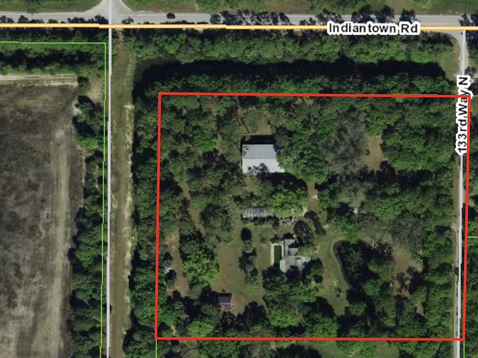 Beautiful 5.32 acre piece of property that borders the over 6,000 acres of Pine Glades Nature Park...the best place for sunsets in Palm Beach county! Design your own paradise. Property is located off a private, paved road. Parcel includes an old farmhouse, detached garage, horse barn, nursery, quilting shed...but the highlight is the 3500 sq ft metal utility building! Park-like grounds and a pond frame this corner of Jupiter Farms to be the enchanting landscape of your dreams!