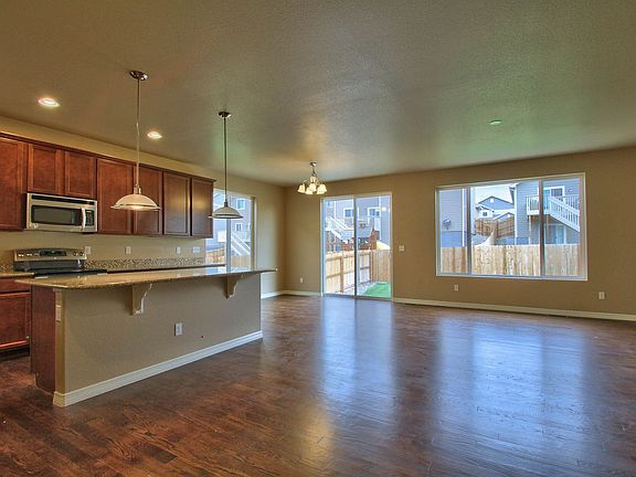 This ranch home has an open floor plan with 9' ceilings.. The kitchen has maple cabinets and a large island overlooking the nook and great room. This home has a master suite and an additional large bedroom. There is a covered front porch and front yard landscaping with an automatic sprinkler system.