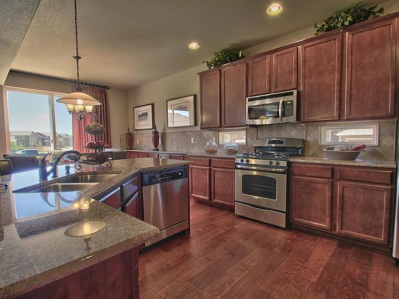 This home has a very open floor plan with 9' ceilings.. The kitchen has maple cabinets and a wrap around island overlooking the nook and great room. On the upper level is a luxurious master suite, 2 additional bedrooms, a laundry room, and loft for entertaining. This house has a tandem 3-car garage and includes front yard landscaping with an automatic sprinkler system.