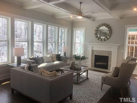 Move In Ready! This "Sullivan" green-certified home in Bridgewater at Traditions is by locally-owned Homes By Dickerson and backs to the Wake Forest Reservoir! 1st floor features a formal dining room, open kitchen/family, guest suite & screened porch with fireplace. Second floor features large master suite with a pedestal soaking tub, 3 guest beds, 2 baths, and a large rec room. Unfinished walk-up attic. 57 HERS! Enjoy resort-style living with a pool, parks, trails & more!